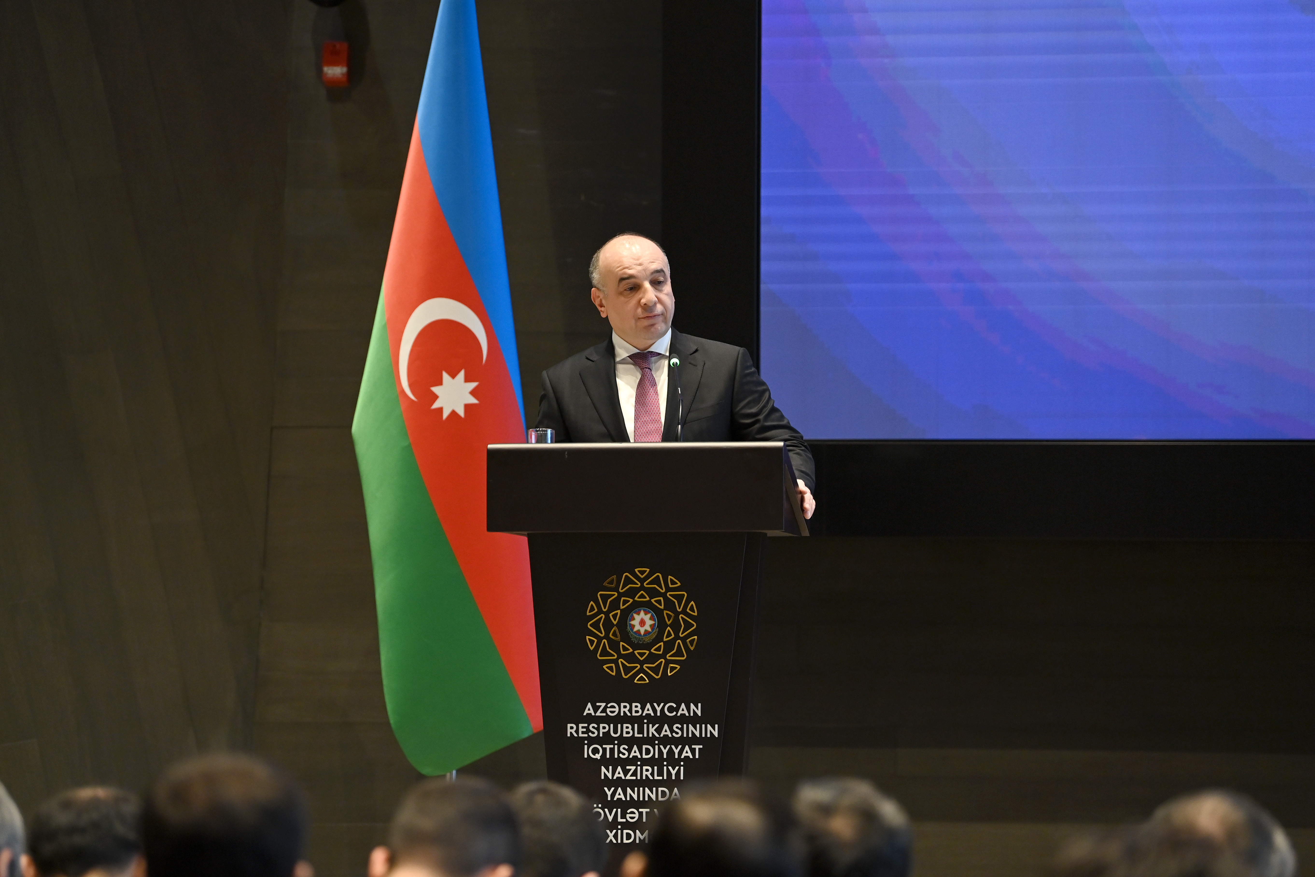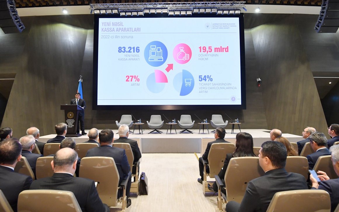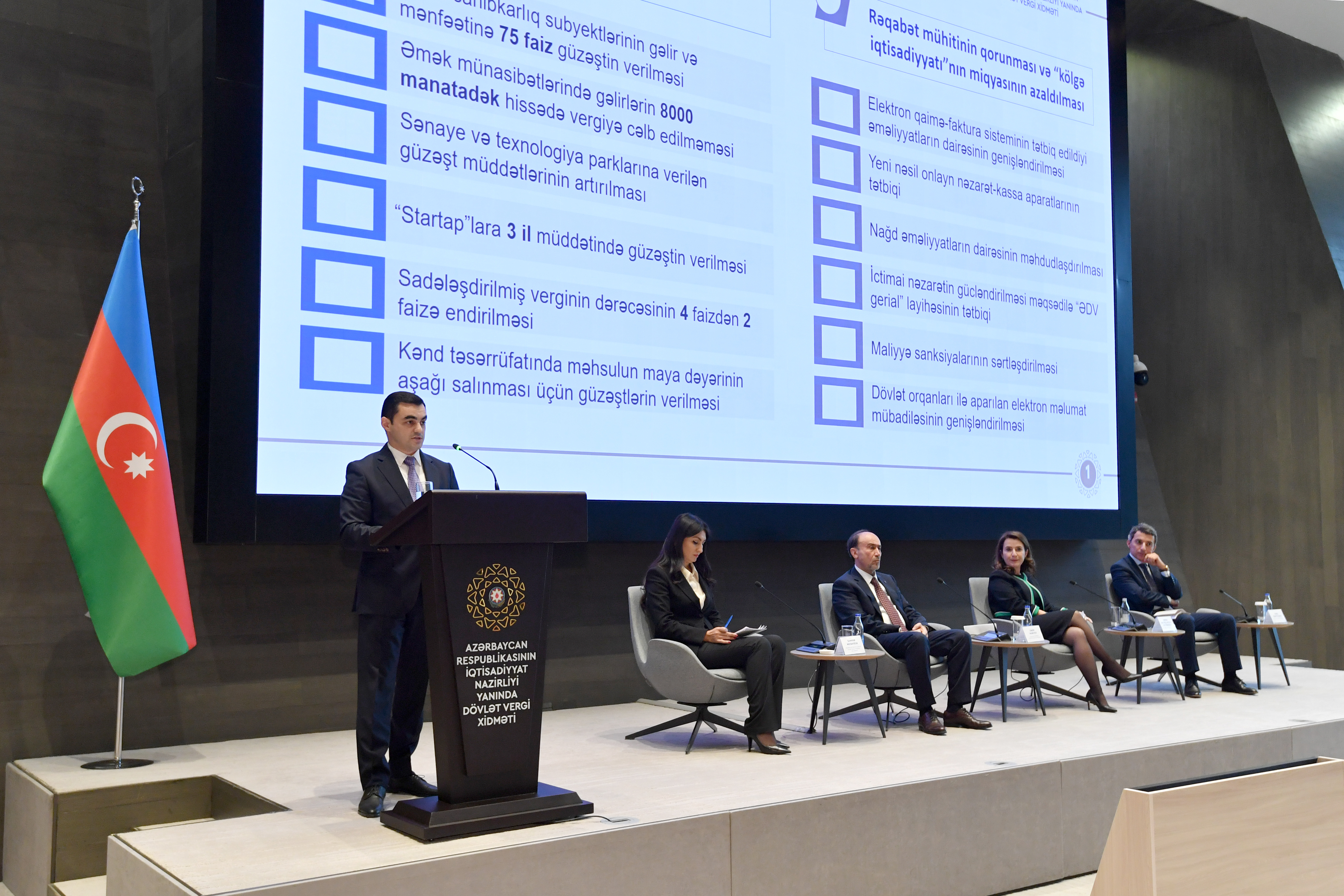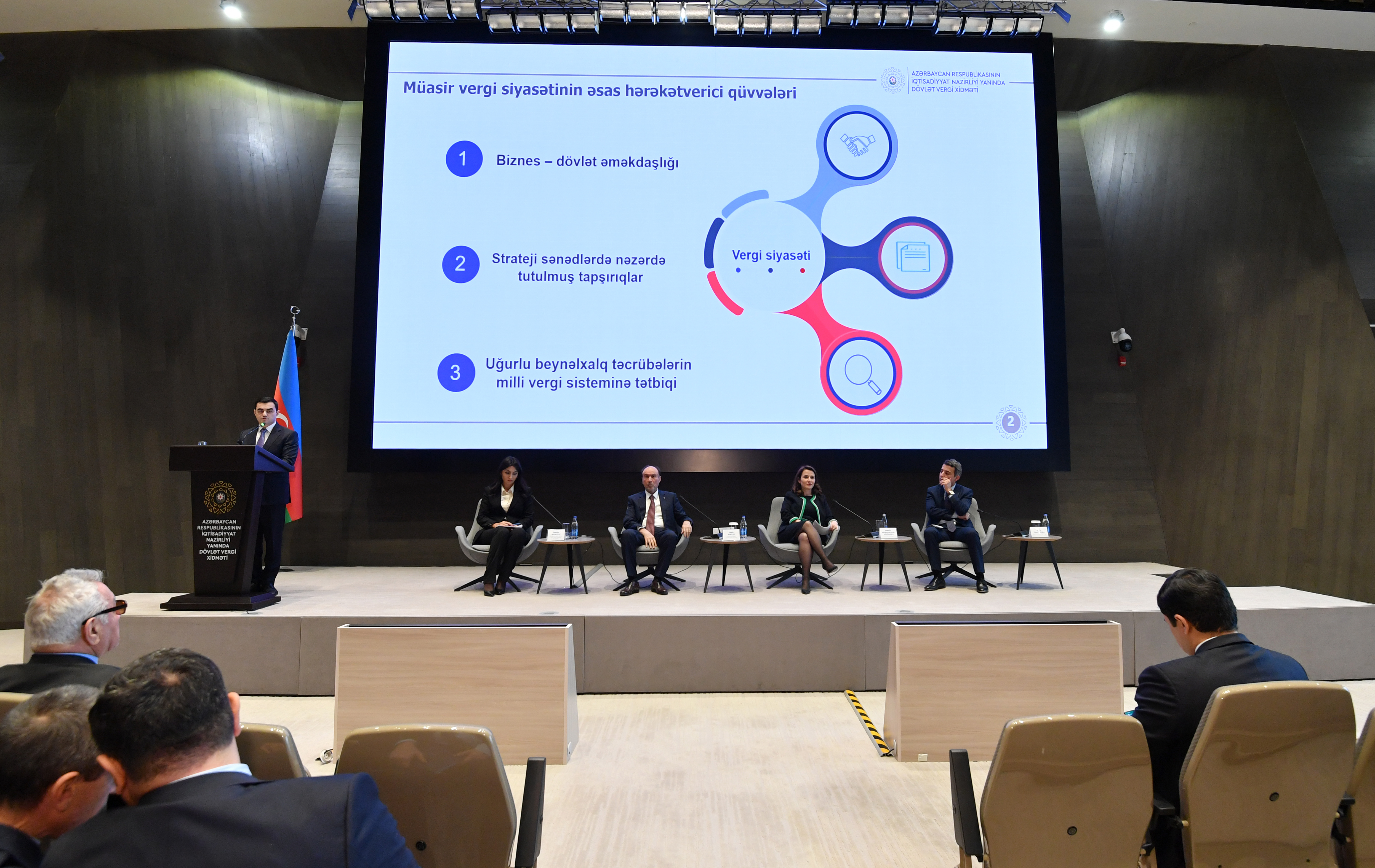 Tədbirdə çıxış edən iqtisadiyyat naziri Mikayıl Cabbarov ulu öndər Heydər Əliyevin ölkənin iqtisadi tərəqqisi və sahibkarlıq mühitinin inkişafına xüsusi əhəmiyyət verdiyini vurğulayıb: “Biz bazar iqtisadiyyatını vergi yolu ilə tənzimləməliyik” - tezisi ilə vergi siyasətinin milli iqtisadi strategiyanın mühüm tərkib hissəsi kimi aparıcı rolunu qeyd edən Ümummilli Lider müstəqil Azərbaycan dövlətinin vergi sisteminin formalaşmasının təşəbbüskarı və banisidir”. M.Cabbarov bildirib ki, ümummilli lider Heydər Əliyevin əsasını qoyduğu milli vergi sistemi son 20 il ərzində Azərbaycan Respublikasının Prezidenti İlham Əliyevin rəhbərliyi altında əsaslı modernizasiya prosesi keçib, maddi-texniki bazası genişləndirilib, vergi inzibatçılığı texnoloji cəhətdən əsaslı surətdə yenidən qurulub. 2022-ci ildə neft və qazın qiymətlərinin müsbət dinamikasının yüksək səviyyəsinə baxmayaraq, dövlət büdcəsinin gəlirlərinin 50 faizinin qeyri-neft-qaz sektoru hesabına formalaşdığını qeyd edən nazir büdcə gəlirlərinin artmasında və əldə olunan uğurlarda vergi orqanlarının əhəmiyyətli roluna diqqət çəkib. Ölkədə iqtisadi artımın təmin edilməsi prosesində vergi sisteminin tənzimləyici funksiyalarının mühüm rol oynadığını bildirən M.Cabbarov qarşıdakı dövrdə vergi siyasətinin əsas hədəflərini açıqlayıb. O, bu hədəflərin, ilk növbədə, iqtisadi təşviq əsasında reallaşdırılacağını vurğulayıb: “Biz bunu işğaldan azad edilmiş ərazilərin nümunəsində görürük. Bildiyiniz kimi, bu ilin əvvəlindən, cənab Prezidentin tapşırıq və təşəbbüsünə əsasən, vergi, sosial müdafiə, gömrük qanunvericiliyi sahəsində çox geniş təşviqlər qəbul edilib”. Nazir qeyd edib ki, vergi siyasətində rəqəmsallaşmanın genişləndirilməsi mühüm istiqamətdir. Xüsusilə son aylar ərzində Dövlət Vergi Xidməti ilə Dövlət Gömrük Komitəsi arasında əməkdaşlığın sinxronlaşdırılması qeyd edilməlidir. Bu, faktiki olaraq, vergi ödəyiciləri üçün eyni yanaşmaların tətbiqinin təmin edilməsinə imkan verib və hər iki qurumun fəaliyyətinin səmərəliliyini artırıb.