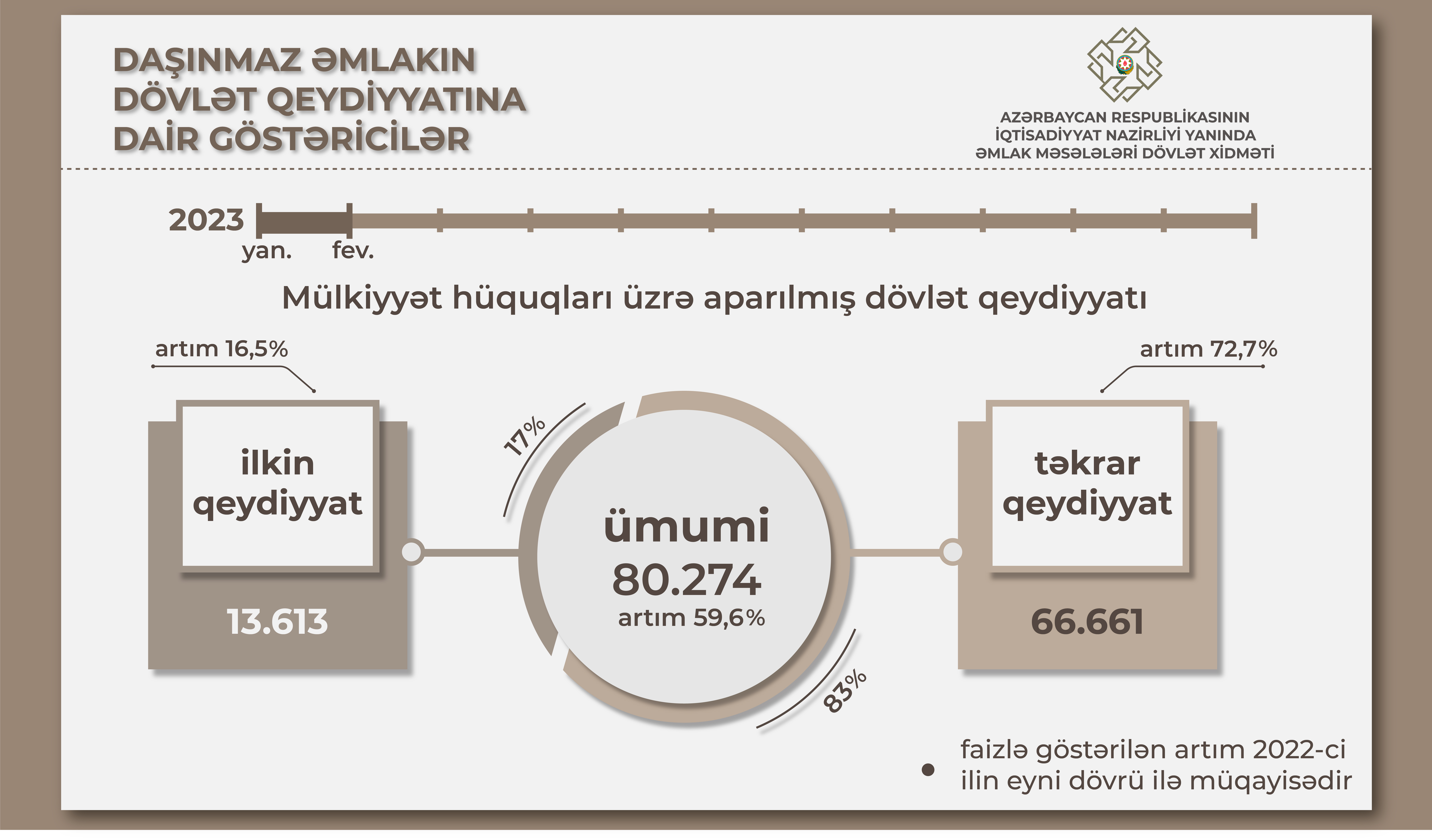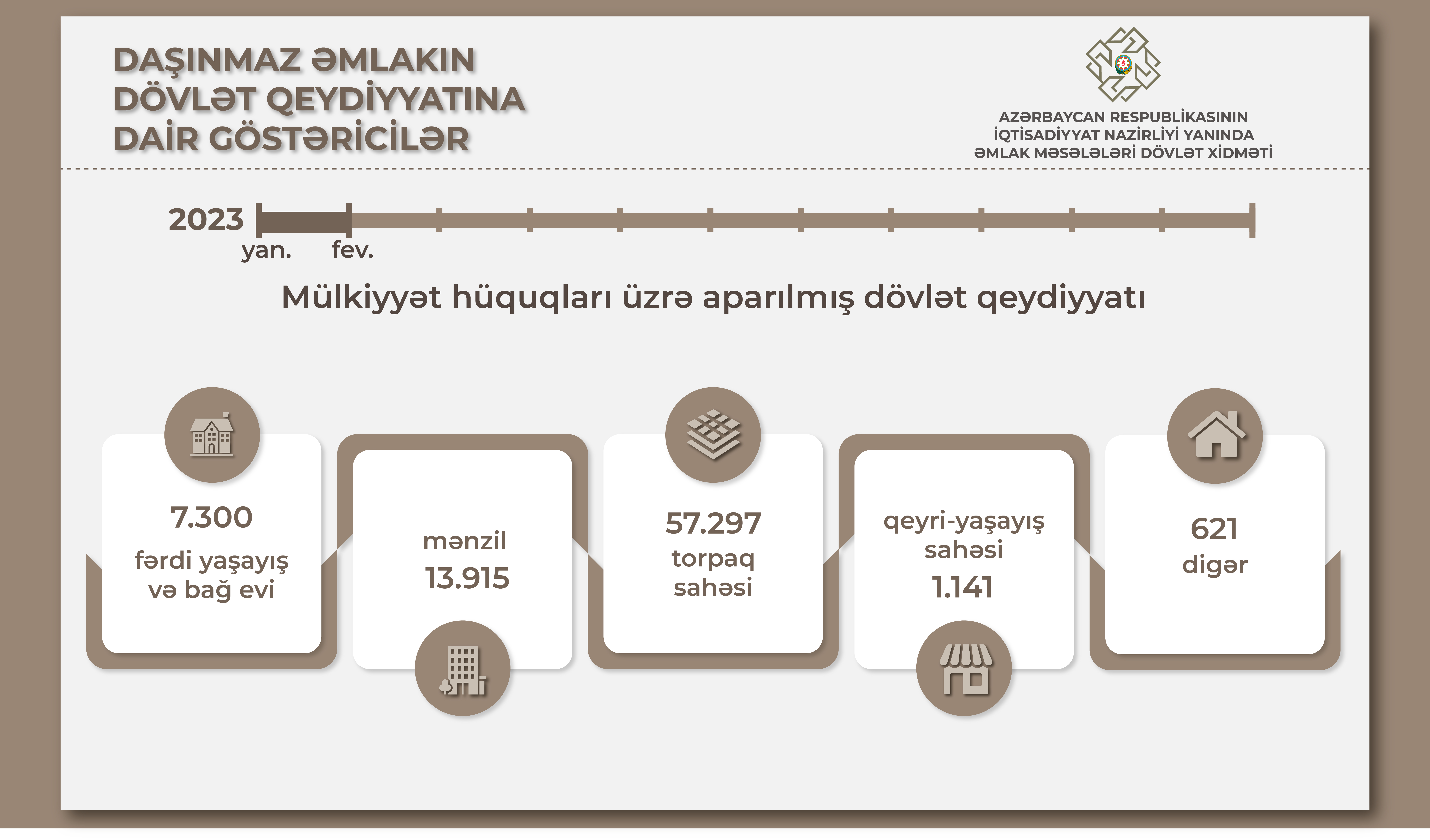 2023-cü ilin yanvar-fevral ayları ərzində mülkiyyət hüquqlarının qeydiyyatı aparılan əmlaklardan 7 300-ü fərdi yaşayış və bağ evi, 13 915-i mənzil, 57 297-si torpaq sahəsi, 506-sı qeyri-yaşayış binası, 1 141-i qeyri-yaşayış sahəsi, 89-u əmlak kompleksi, 26-sı isə çoxmərtəbəli yaşayış binasıdır. Bu dövrdə dövlət qeydiyyatına alınan daşınmaz əmlakların 13 803-ü Bakı şəhərinin, qalanı isə bölgələrin payına düşür.
