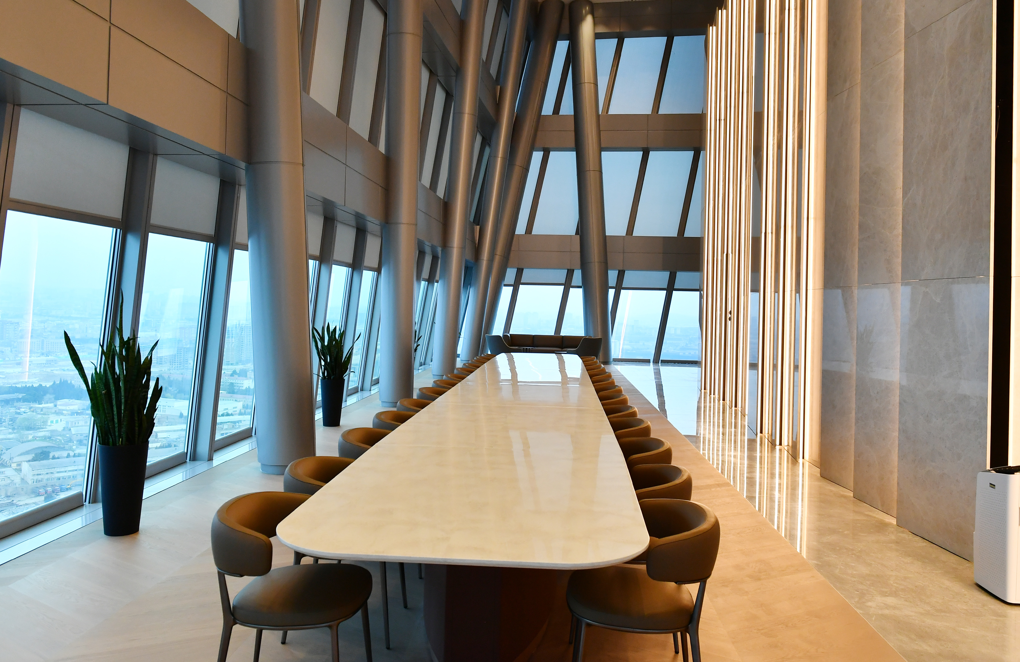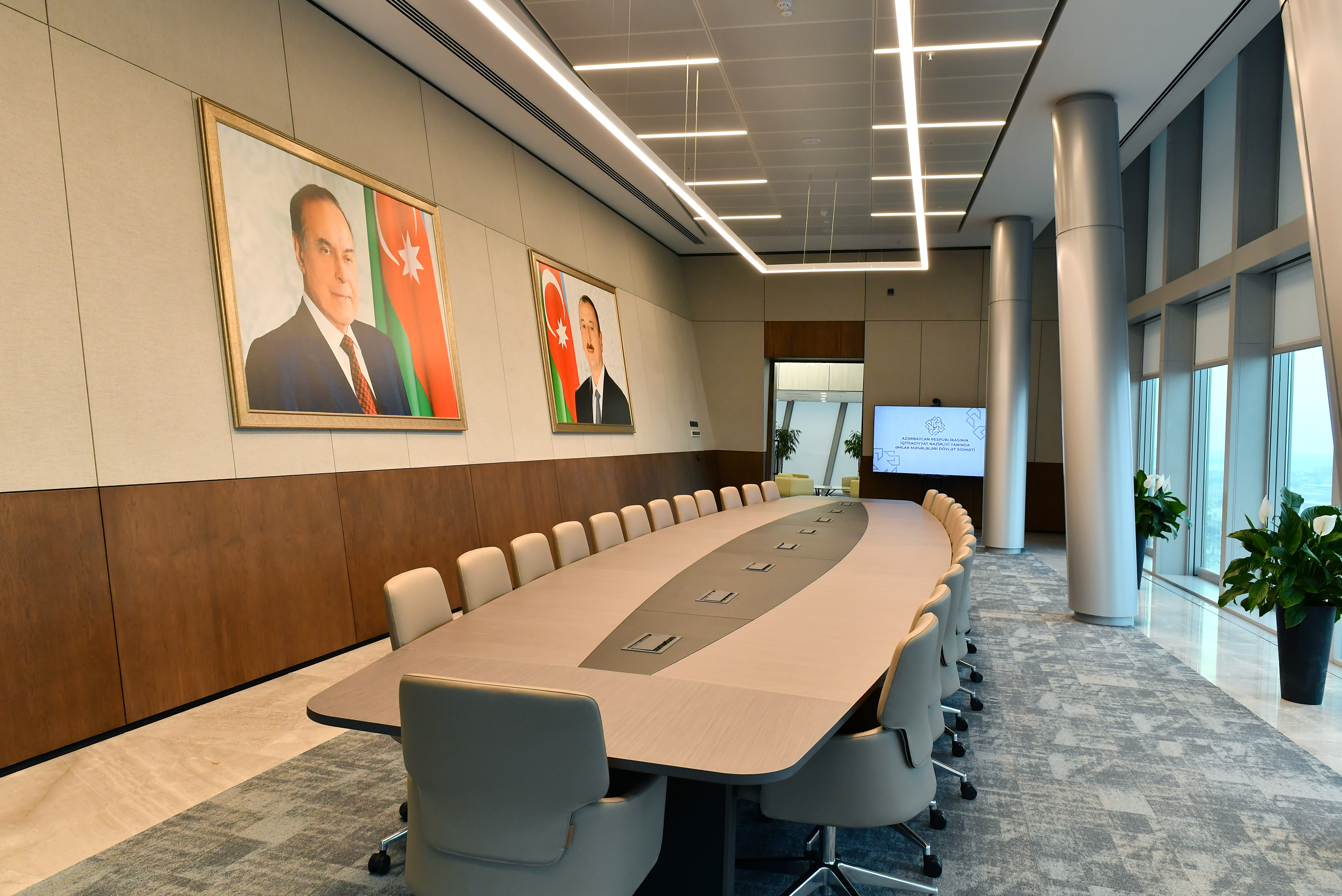 Binanın daha bir diqqətçəkən cəhəti isə yuxarıdan baxanda kürsü mərtəbəsinin Azərbaycanın xəritəsi formasında inşa edilməsi və şərq tərəfdən “Xəzər dənizi” dekorativ hovuzu ilə əhatə olunmasıdır. İşçi mərtəbələri 254 otaqdan ibarət olan binada 537 əməkdaşın fəaliyyəti üçün hər cür şərait yaradılıb. Binada müxtəlif tədbirlərin keçirilməsi üçün hər cür şəraitə malik və müasir multimedia vasitələri ilə təchiz olunmuş konfrans və iclas zalları, həmçinin müxtəlif təyinatlı iclas otaqları, yeməkxanalar var. Binadaxili mikroiqlimin təmin olunması, səmərəli enerji sərfiyyatının tənzimlənməsi, işıqlandırma, yanğınsöndürmə və təhlükəsizlik sistemlərinin idarə edilməsi, fövqəladə hallar zamanı mühəndis-texniki sistemlərin tənzimlənməsi üçün İdarəetmə Mərkəzi qurulub. Göründüyü kimi, yeni binada tikintidə müasir çağırışların paytaxtımızın infrastrukturuna inteqrasiyası ilə yanaşı, işçi heyətin daha səmərəli çalışması üçün hər cür şərait yaradılıb.