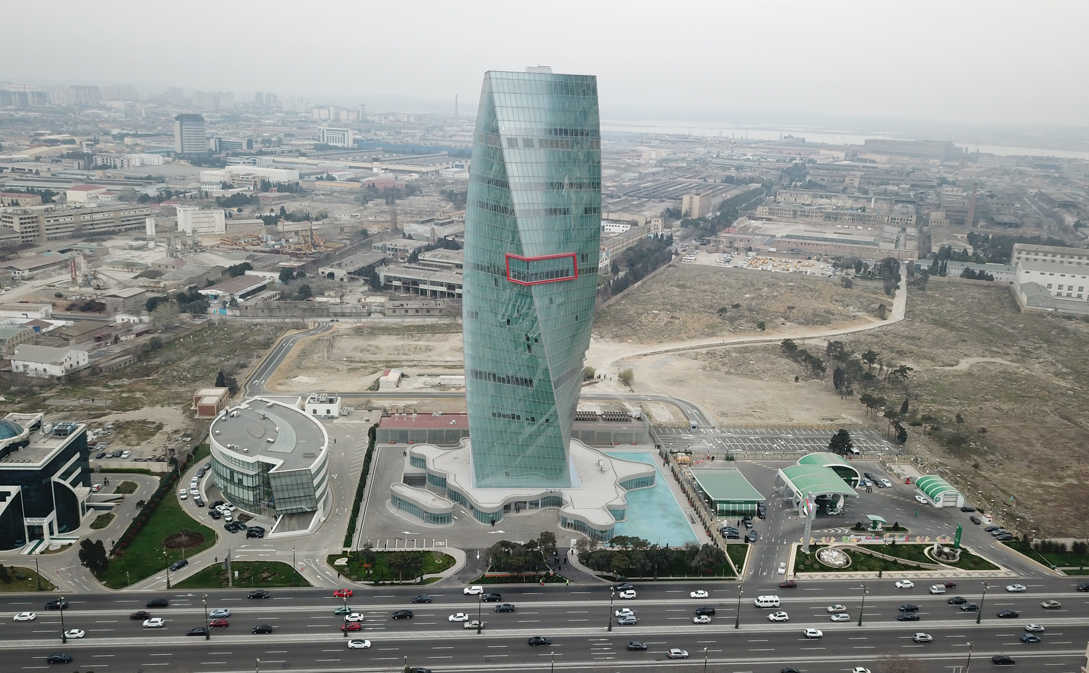 Bildirildi ki, bina modern və postmodern üslubda layihələndirilib və mürəkkəb konstruktiv quruluşa malikdir. Hündürlüyü 125 metr olan bina 33 mərtəbədən ibarətdir. Yükdaşıyan konstruksiyaları 9 ballıq zəlzələyə davamlı olan binanın hər mərtəbəsi digər mərtəbəyə nisbətdə 2,65 dərəcə dönür və nəticədə fasad müstəvisi 90 dərəcəlik burulma effekti yaradır.