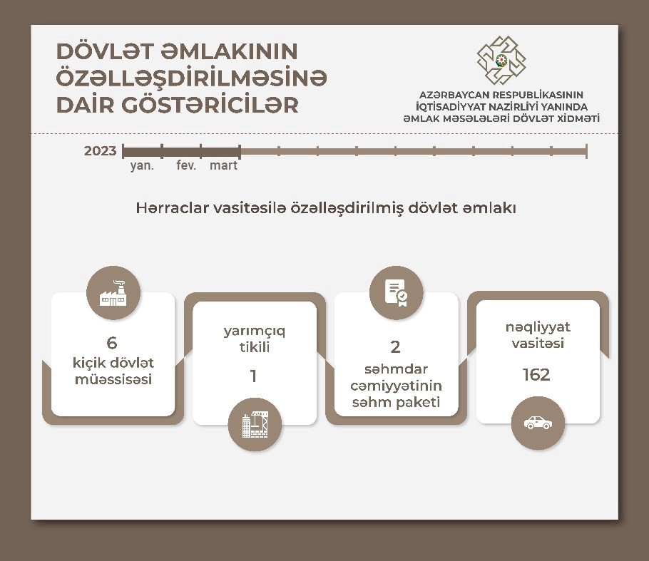 İqtisadiyyat Nazirliyi yanında Əmlak Məsələləri Dövlət Xidməti dövlət əmlakının özəlləşdirilməsi və icarəyə verilməsi, hərracların təşkili sahəsində işləri davam etdirir. Xidmət dövlət əmlakının özəlləşdirilməsi məqsədilə 2023-cü ilin yanvar-mart ayları ərzində 11 hərrac keçirib. Hərraclarda 2 səhmdar cəmiyyətinin səhm paketi, 6 kiçik dövlət müəssisəsi, 1 yarımçıq tikili sahəsi, 162 nəqliyyat vasitəsi özəlləşdirilib.