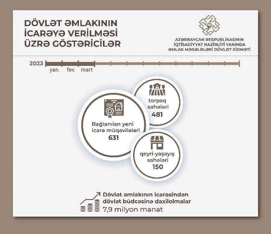 Əmlak Məsələləri Dövlət Xidməti tərəfindən 2023-cü ilin ilk rübündə dövlət əmlakının icarəyə verilməsi ilə bağlı 631 yeni icarə müqaviləsi bağlanılıb. Bunlardan 150-si qeyri-yaşayış, 481-i isə torpaq sahələri üzrə olub.